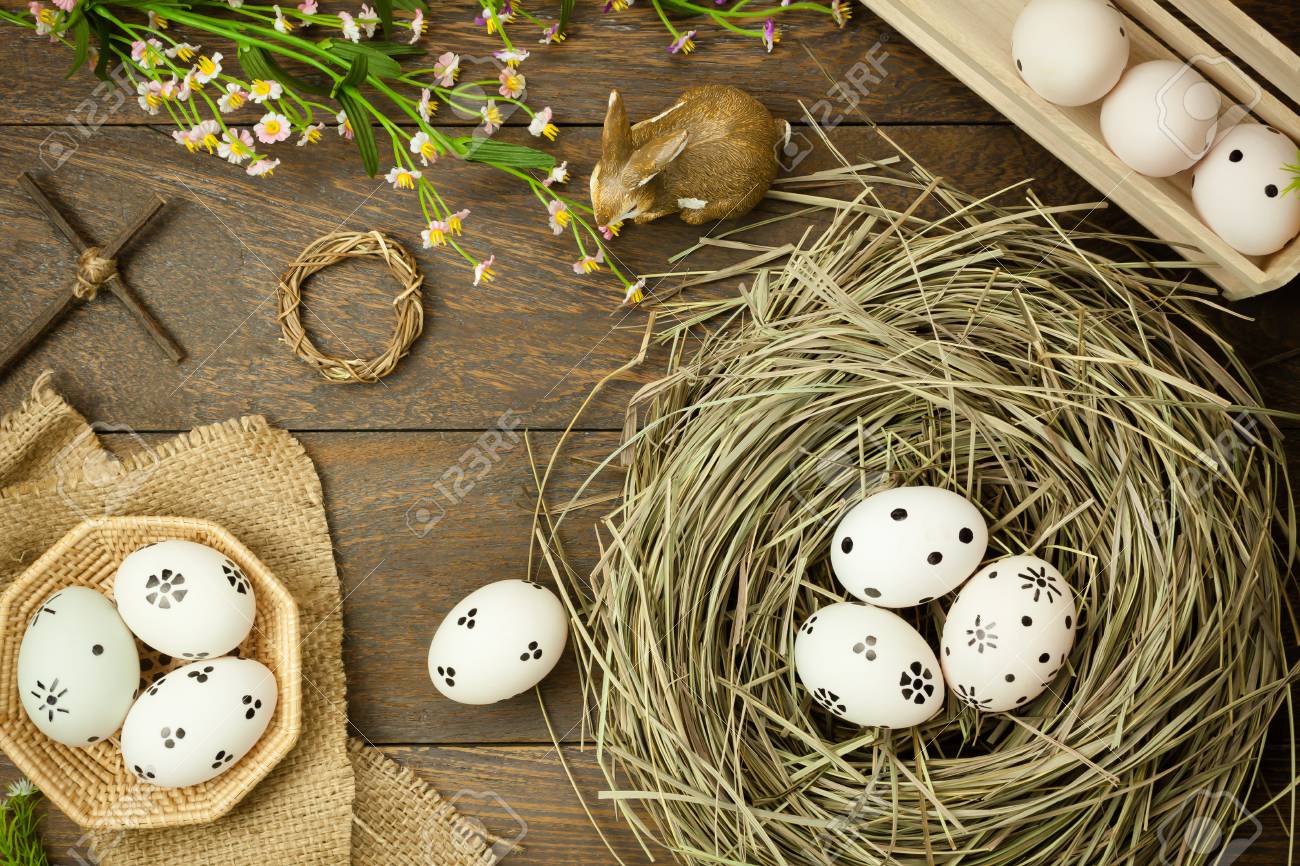 Top View Easter Background Happy Easter Eggs Painted Also Cross