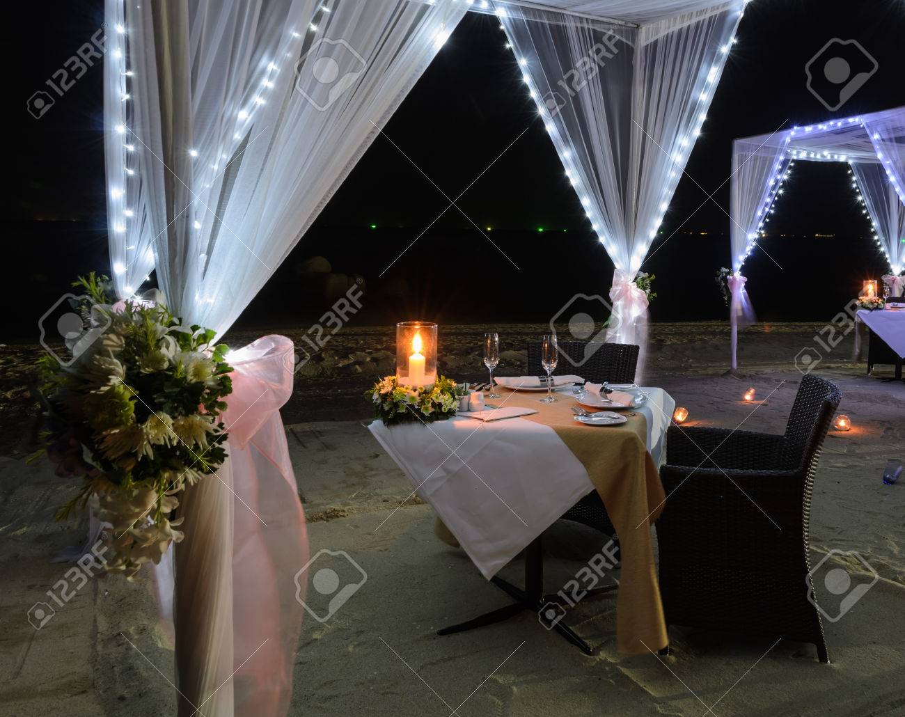 Romantic Dinner Table With White Tent For A Couple On Tropical