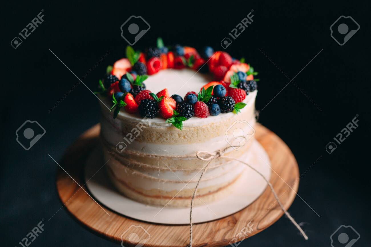 Fruit Cake Cake Decorated With Berries On A Wooden Stand On