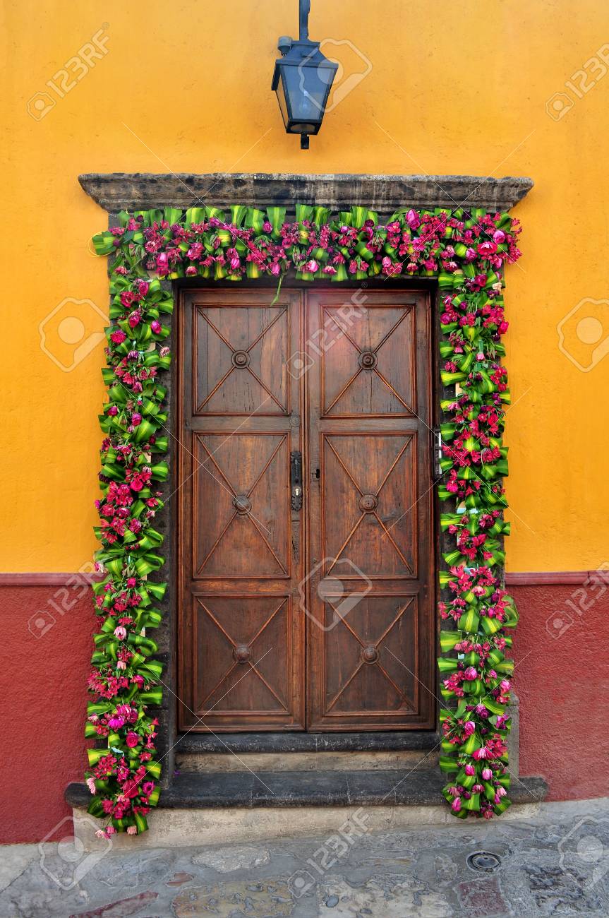 Wooden Brown Front Door At A House With A Flower Decoration And