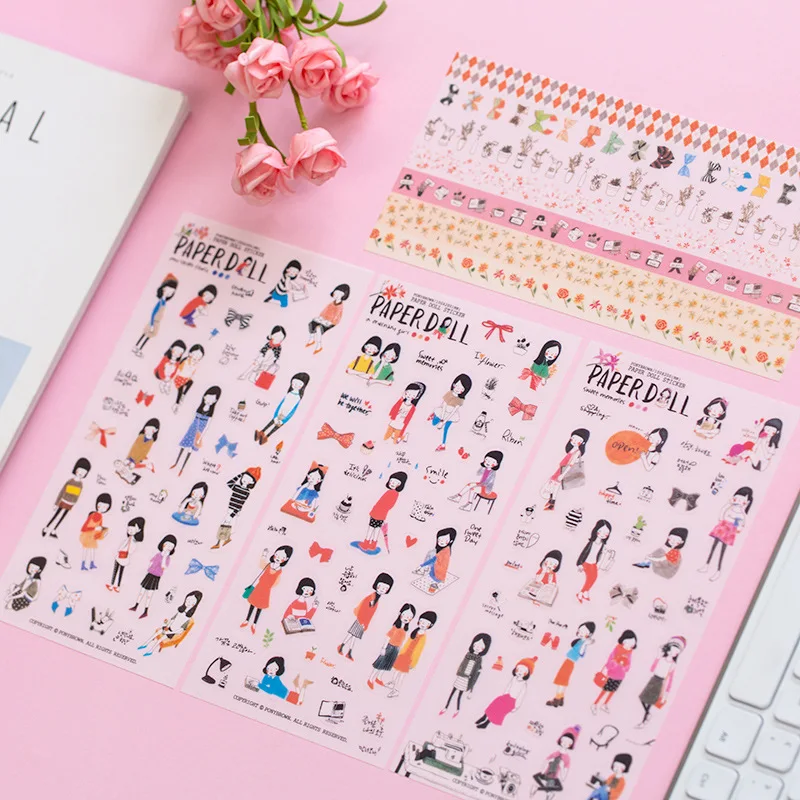 6 Sheet Pack Paper Doll Pencil Drawing Style Stickers Cute Diary