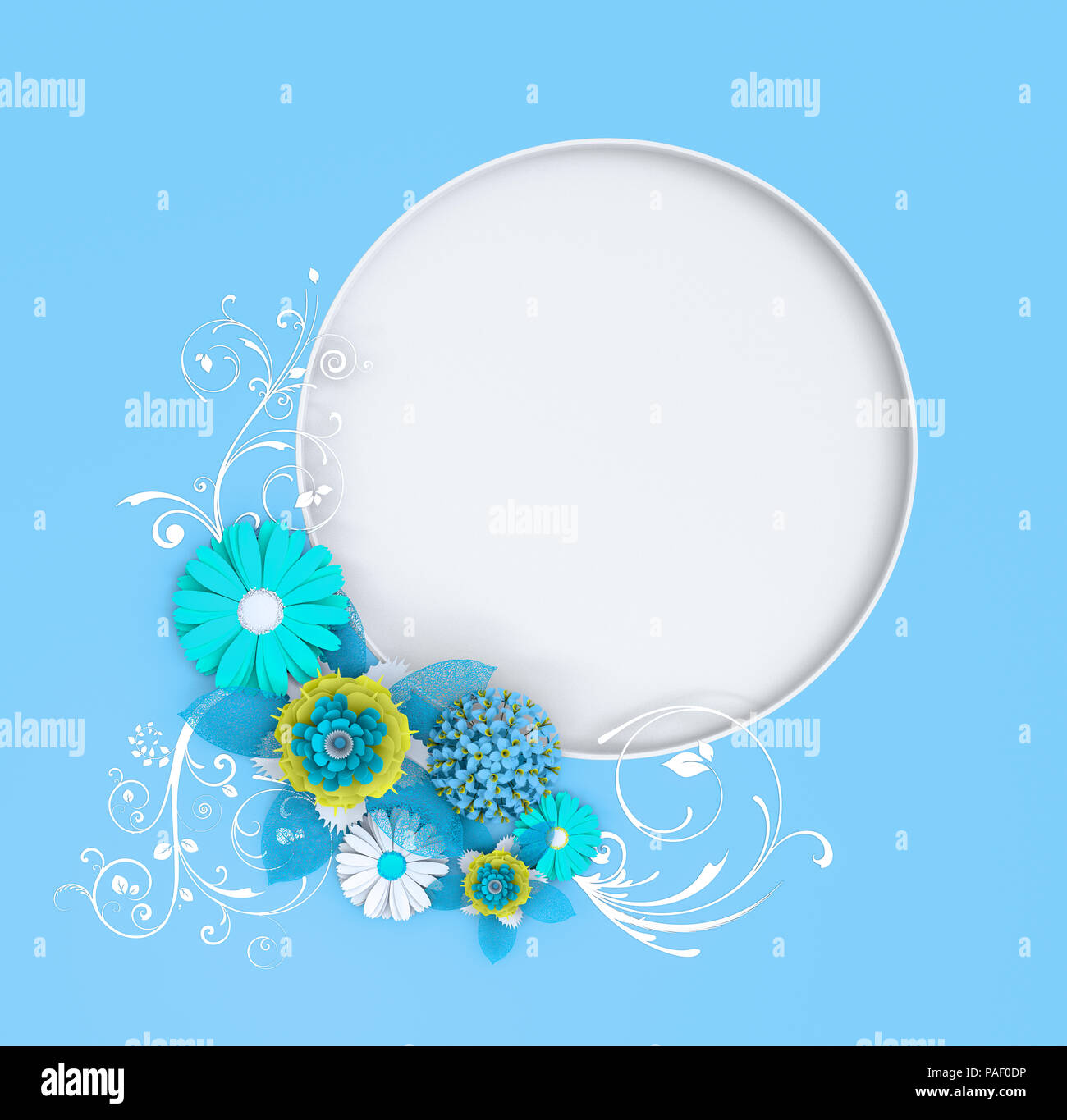 3d Render Abstract White Paper Flowers Round Frame Floral