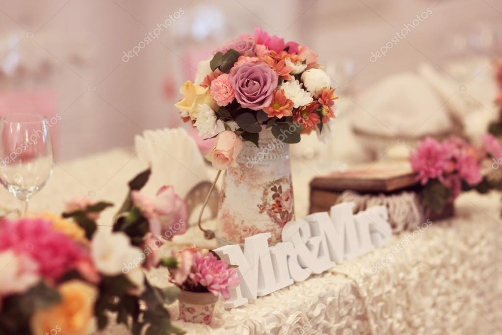 Beautifully Decorated Wedding Table With Flowers And Mr Mrs
