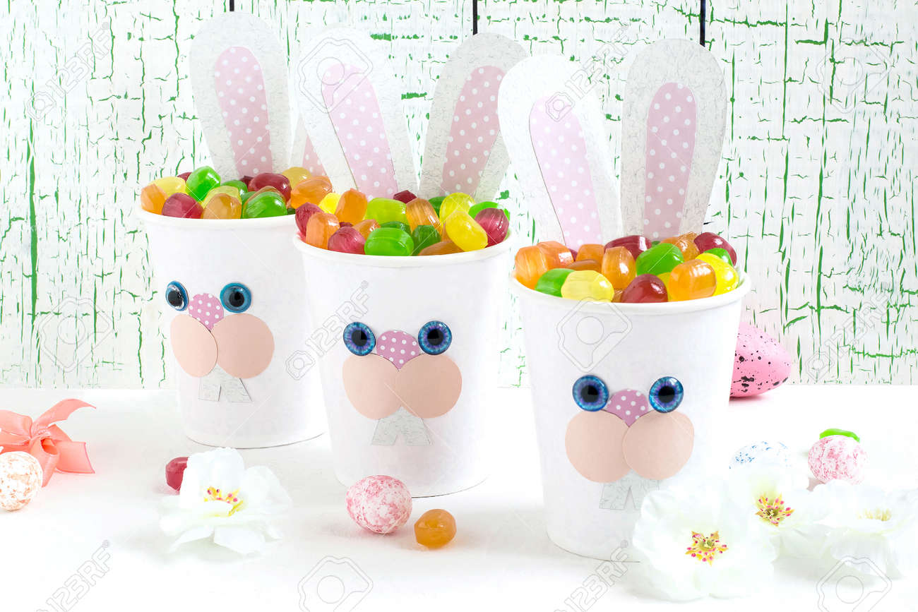 Paper Cups In The Form Of Funny Easter Bunny With Candy Homemade