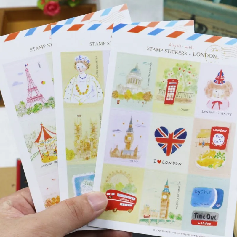 2 Pages 18 Pcs Scenery Stamps Paper Sticker Children Diy