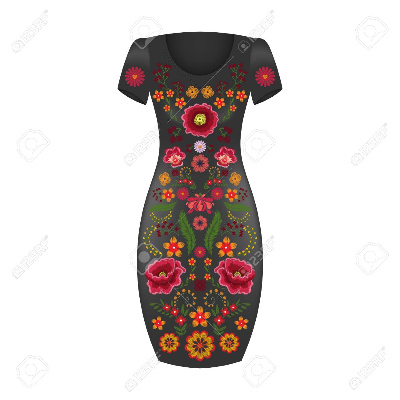 Fashion Dress Template With Floral Embroidery Embroidered Flowers