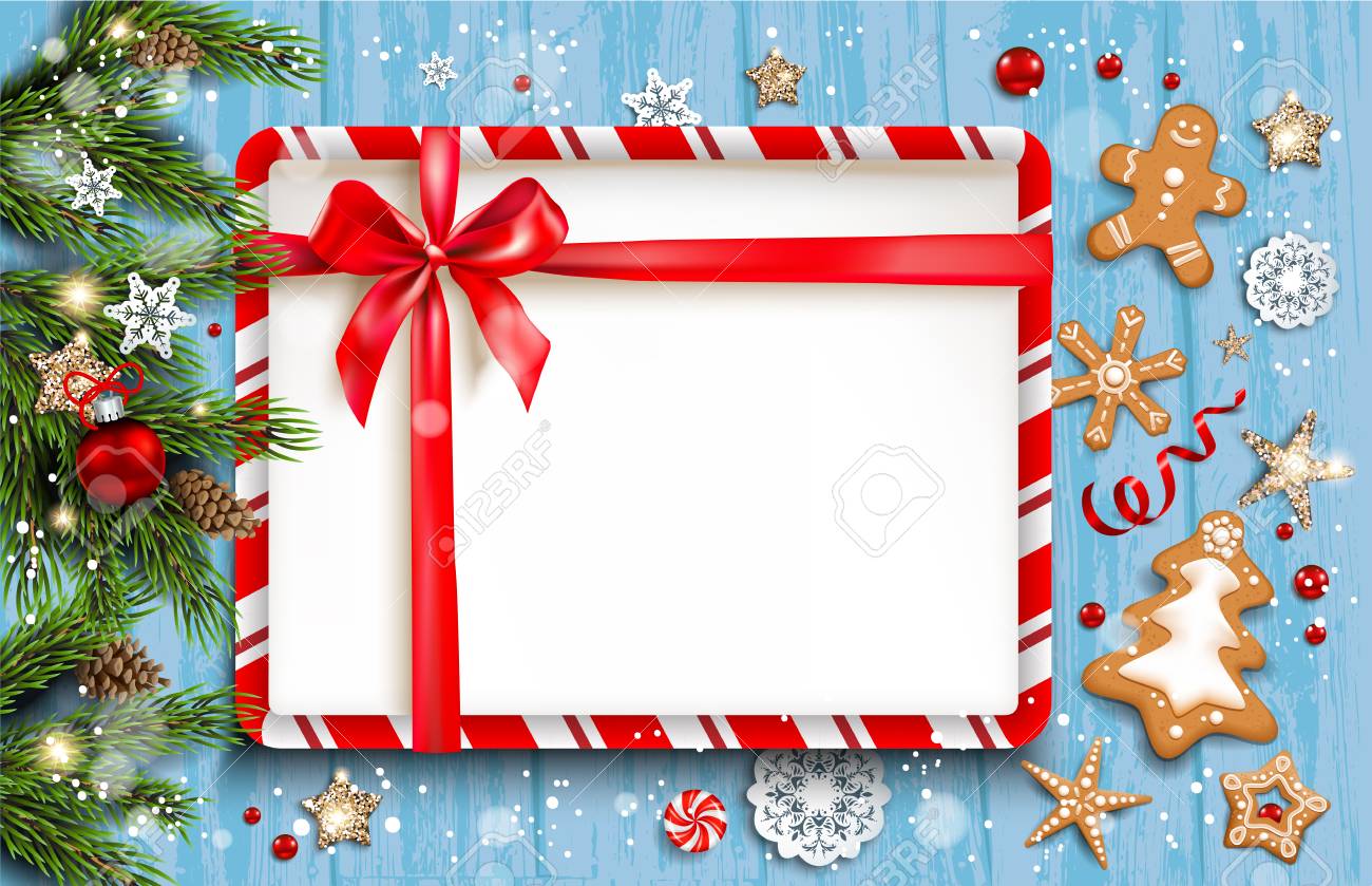 Christmas Frame Of Gift Boxes Fir Tree Branch Festive