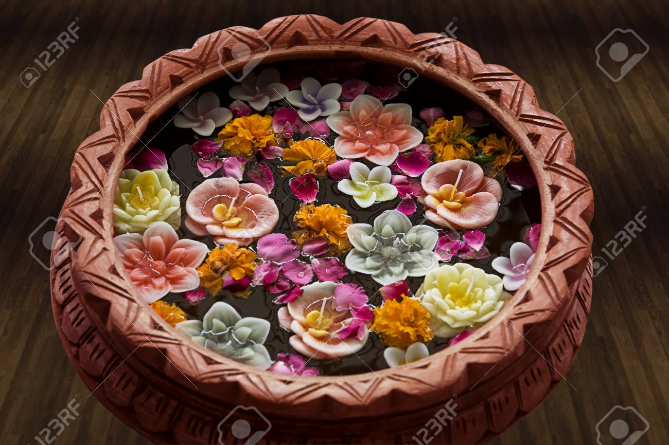 Flower Diyas Floating In A Pot With Water Stock Photo Picture And