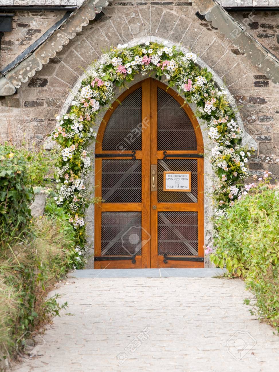 Flower Decorated Entrance Of St Enodoc Church In Cornwall Stock