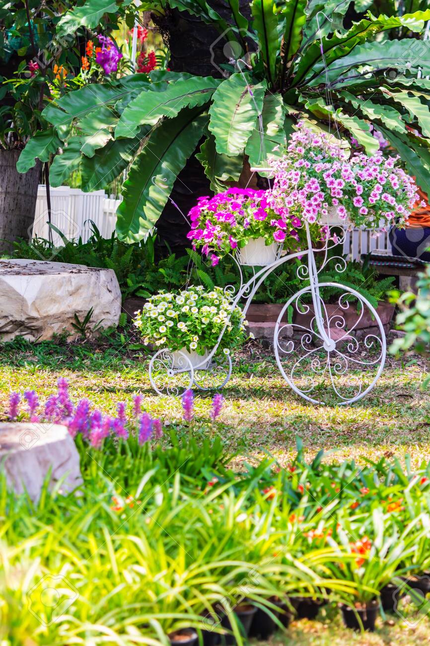 Vintage White Bike And Flower Pot Decoration In Cozy Home Flowers