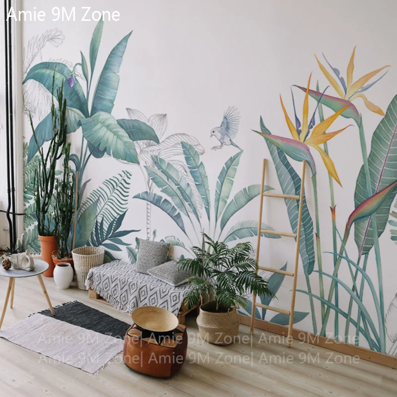White And Pale Green Plants Hand Drawing Wall Paper Mural On The