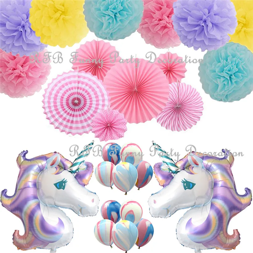 Diy Hanging Party Paper Fan Set Unicorn Foil Balloons Paper Pom