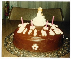 Vintage 80s Photo Round Birthday Cake W Chocolate Icing Doll
