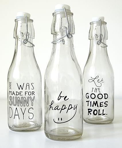 Set 3 Clear Glass Bottles With Fun Slogans Metal Plastic Clasp