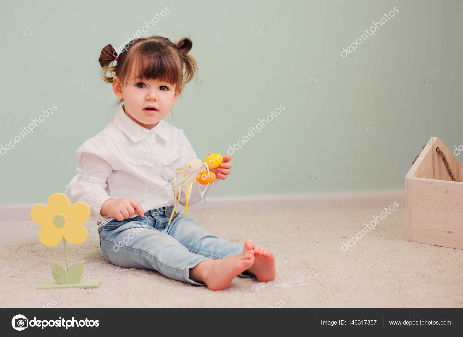 Close Up Indoor Portrait Of Cute Happy Baby Girl Playing With