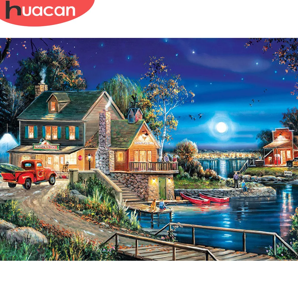 Huacan Diy 5d Diamond Painting Landscape Lodge Full Drill Round