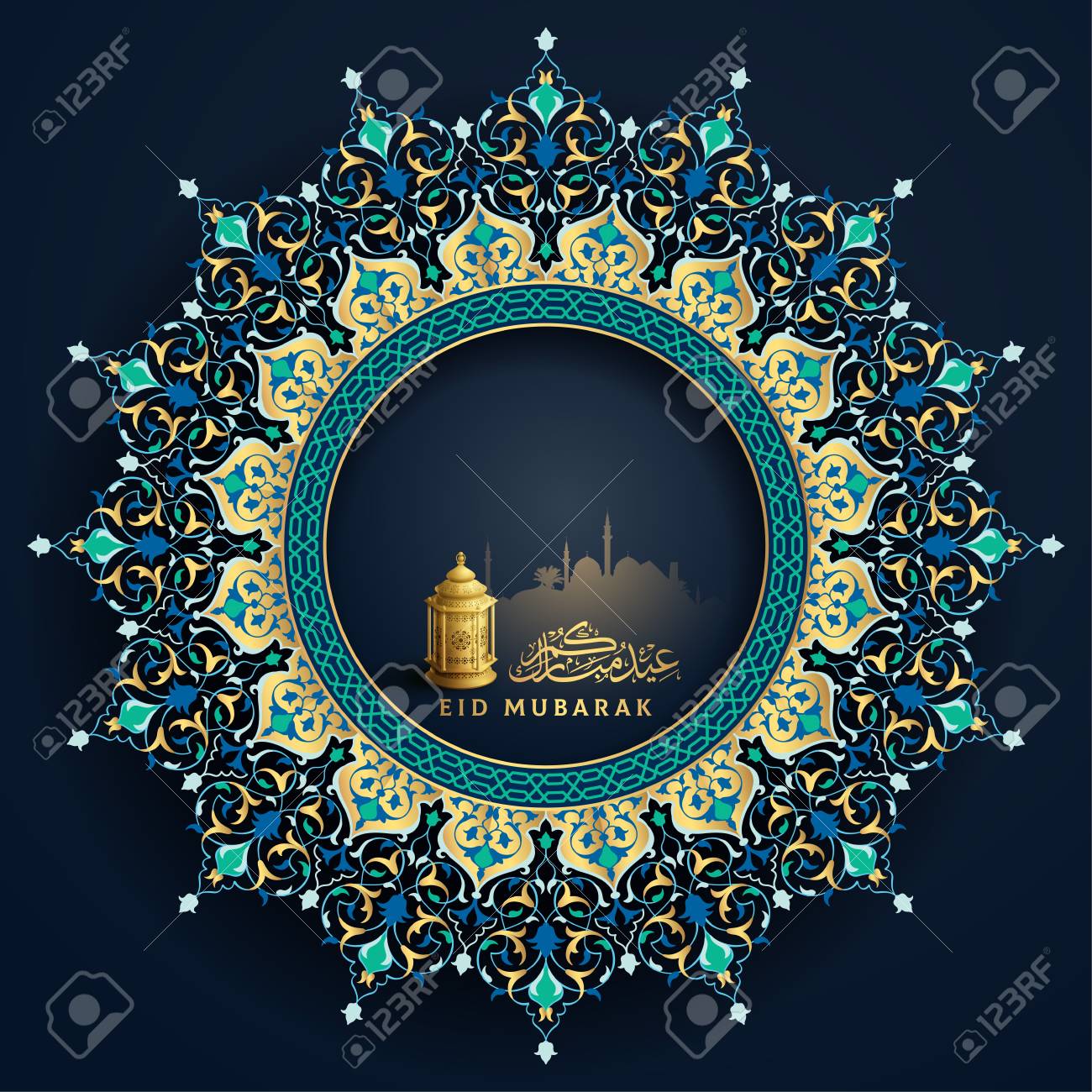 Eid Mubarak Arabic Calligraphy With Traditional Lantern And Floral