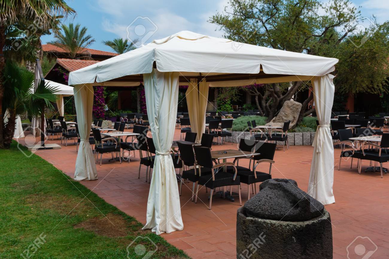 Chairs And Tables Under Gazebo With White Tent Stock Photo