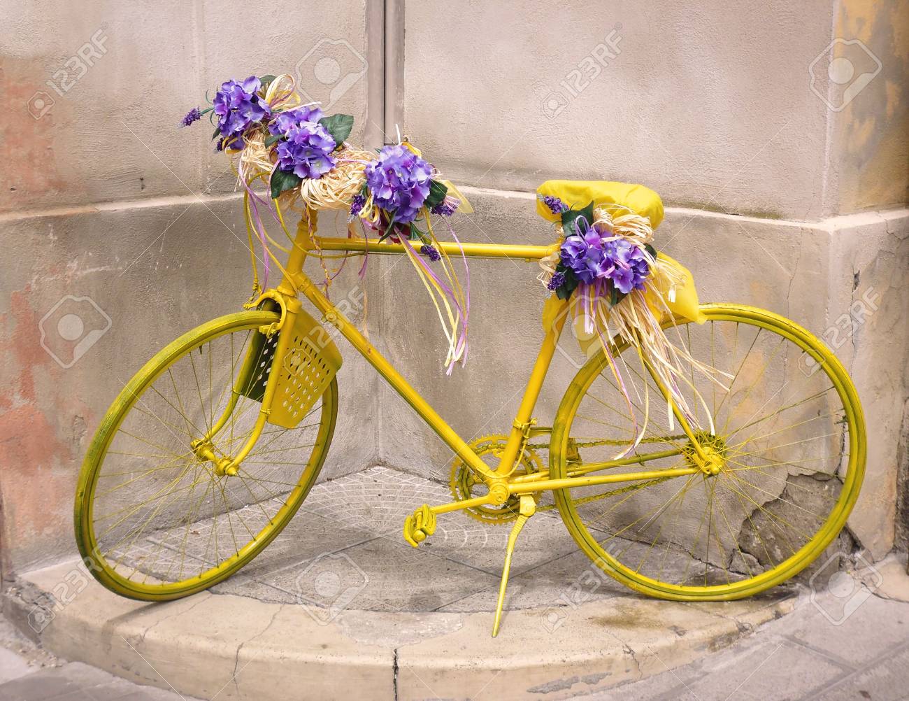 Yellow Bike Shop Decoration Covered In Flowers Stock Photo