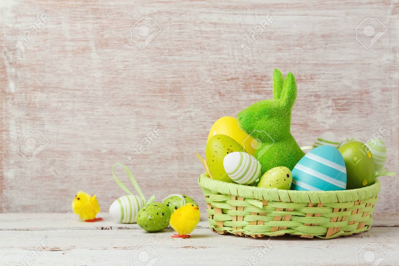 Easter Holiday Decorations With Eggs And Bunny In Basket Over