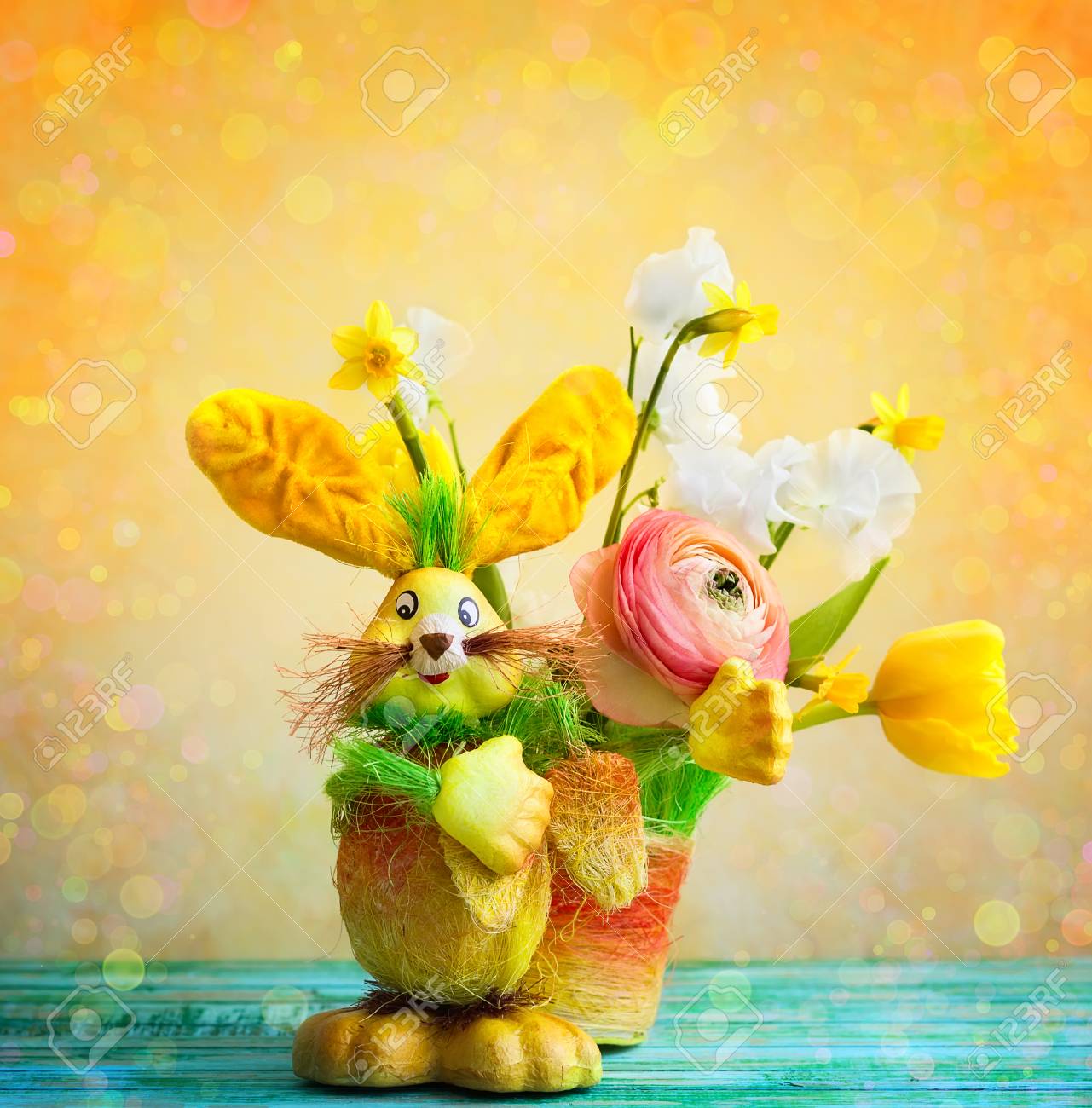 Easter Holiday Decorations With Bunny Chicks Chocolate Eggs