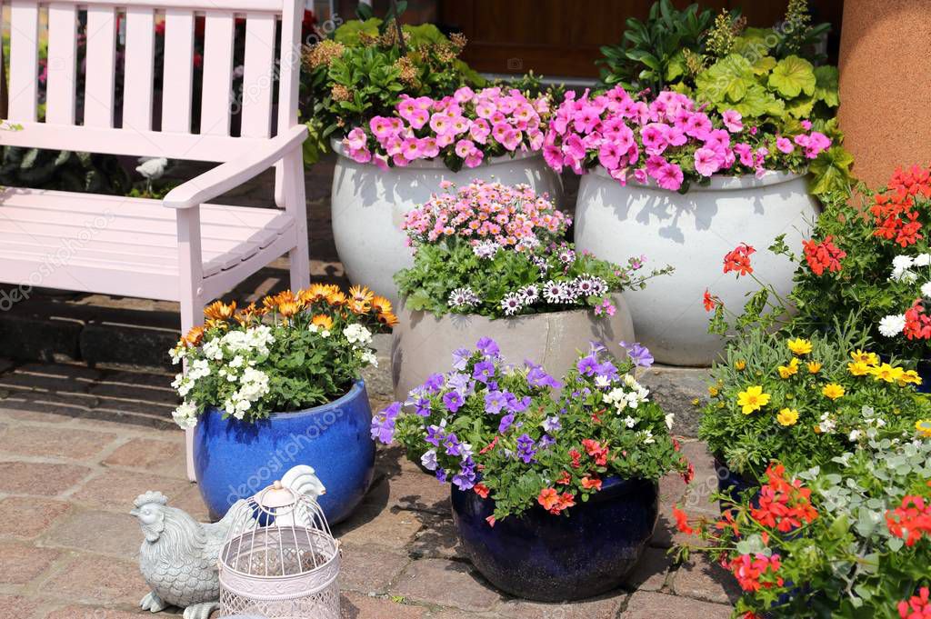 Colorful Garden In Summer With Garden Decorations Stock Photo