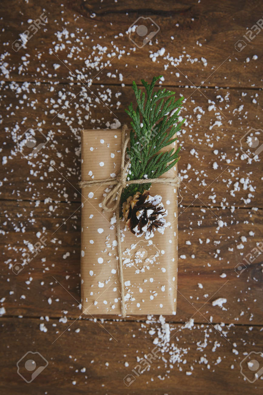 Christmas Gift With Pine Cone Leaf And Fake Snow Decoration Stock