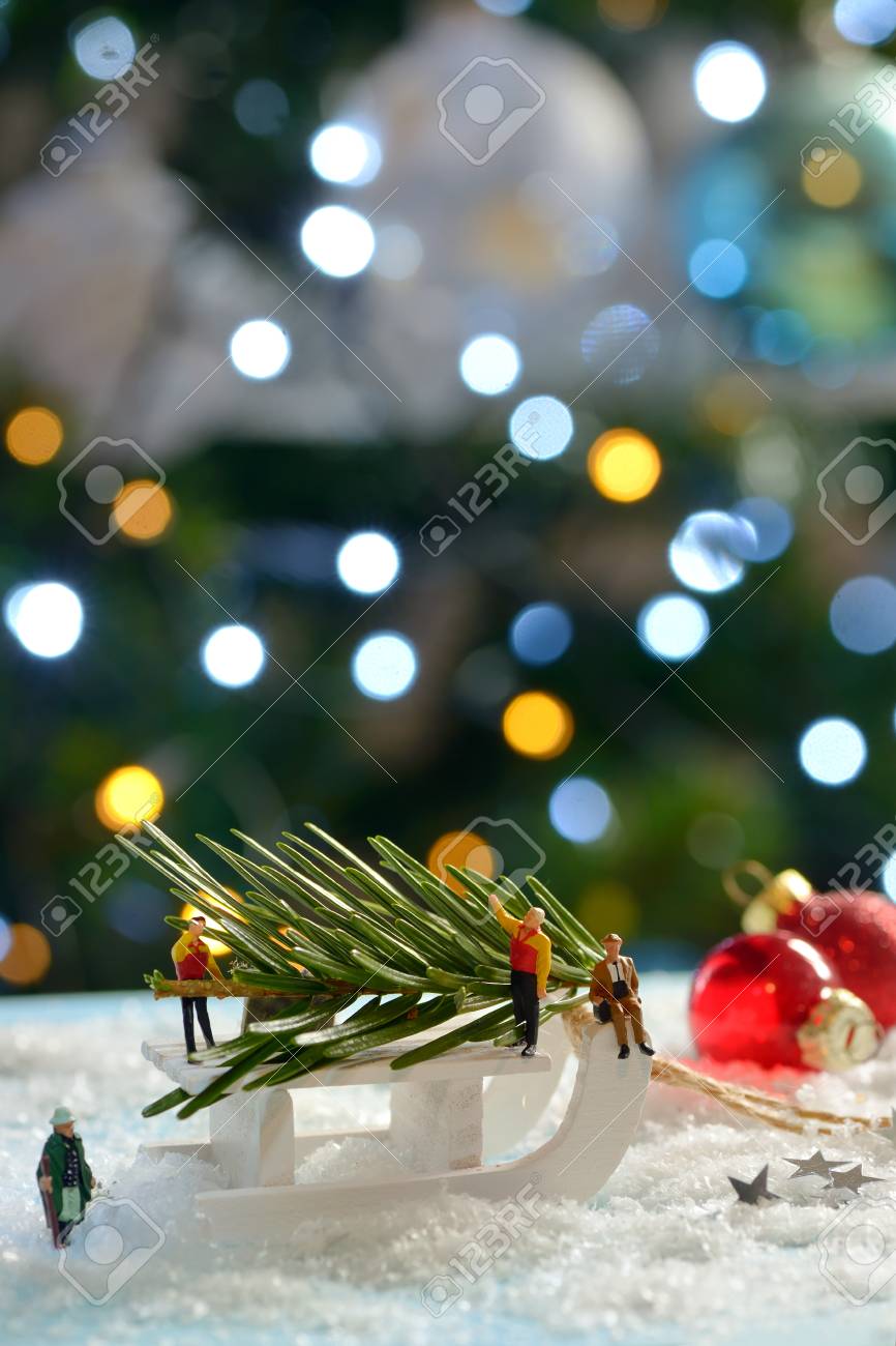Christmas Tree And Sleigh Decoration With Figurines On Fake Snow