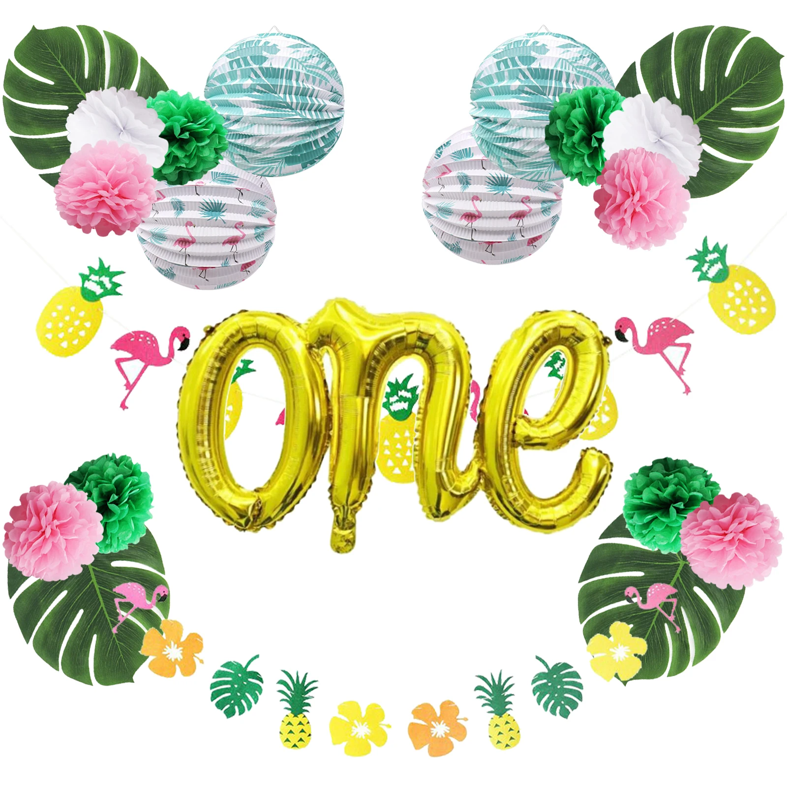 E38 Hawaiian Party Decorations 15pcs Set With Flamingo Garlands