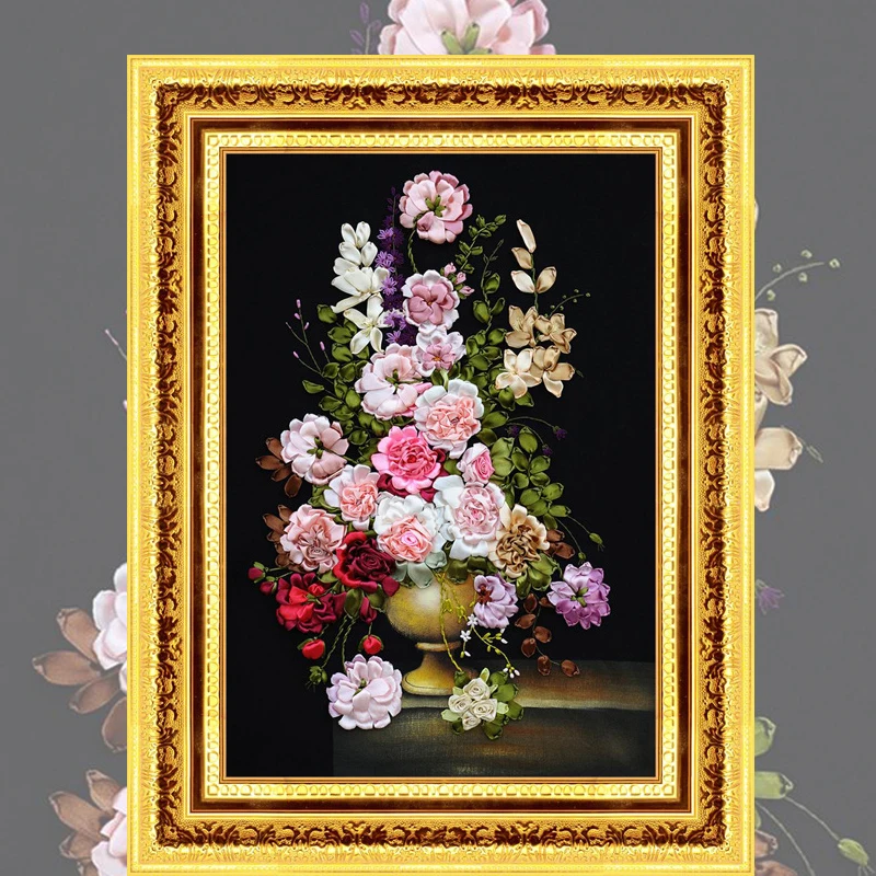 Diy Ribbons Embroidery Pink Flowers Decorative Canvas Painting
