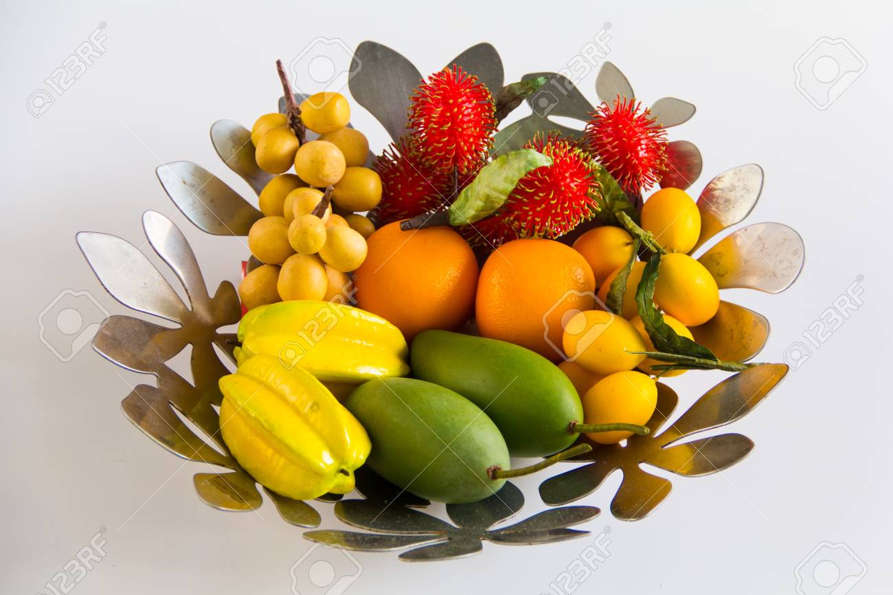 Thai Fruit Carving In Wicker Basket Decoration Stock Photo