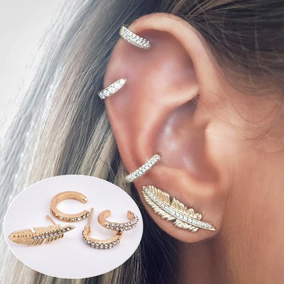 4pcs Set Vintage Gold Crystal Ear Cuff Earrings Charm Feather Leaf
