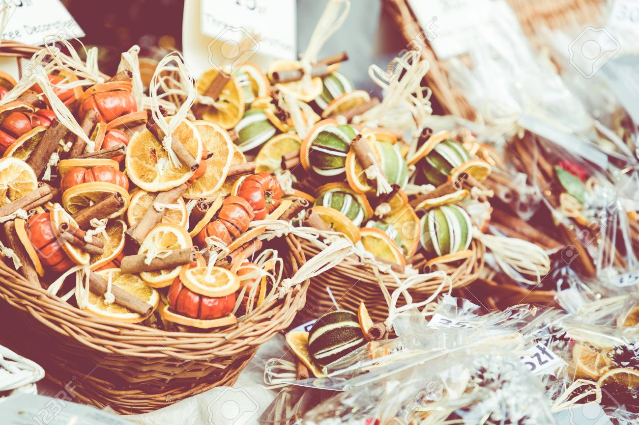 Christmas Dry Fruits Decorations At A Christmas Market Stock Photo