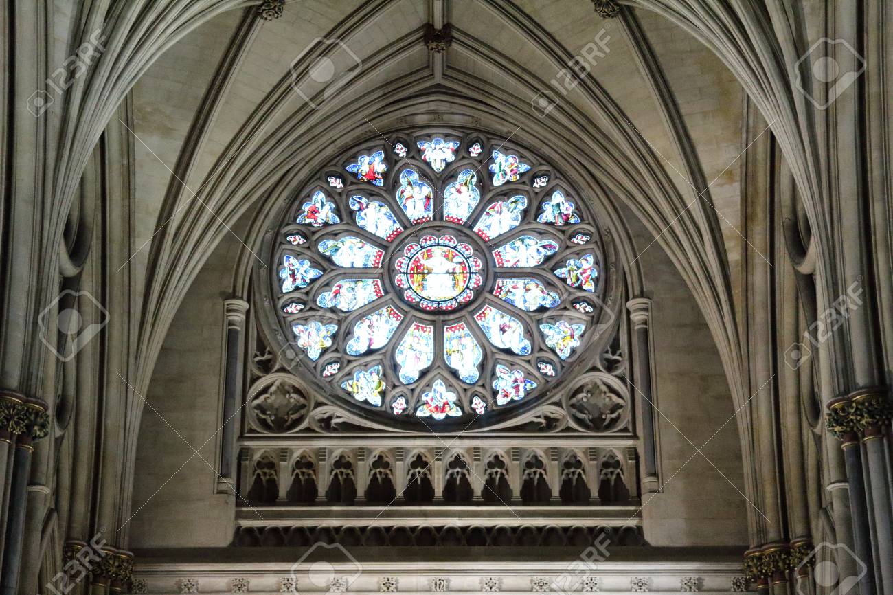 The Main Rose Window Under The Pointed Arch Vault With Colored